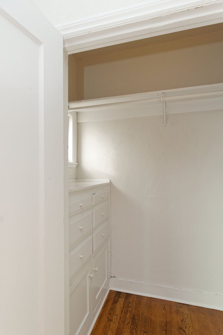 This large one bedroom apartment has IN-UNIT LAUNDRY, beautiful hardwood floors, double hung dual pane windows, four closets, fresh paint, and an updated kitchen with nice appliances. Plenty of storage in a gorgeous space.